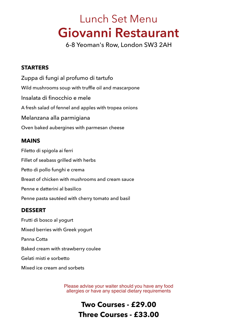 Welcome to Giovanni Restaurant, a delightful culinary gem nestled in the charming streets of London at 6-8 Yeoman's Row. With its welcoming ambiance and a menu that showcases the best of Italian cuisine, Giovanni invites you to indulge in a memorable dining experience. Located just five minutes from the iconic Harrods, this restaurant promises not only great food but also a serene escape from the hustle and bustle of the city.